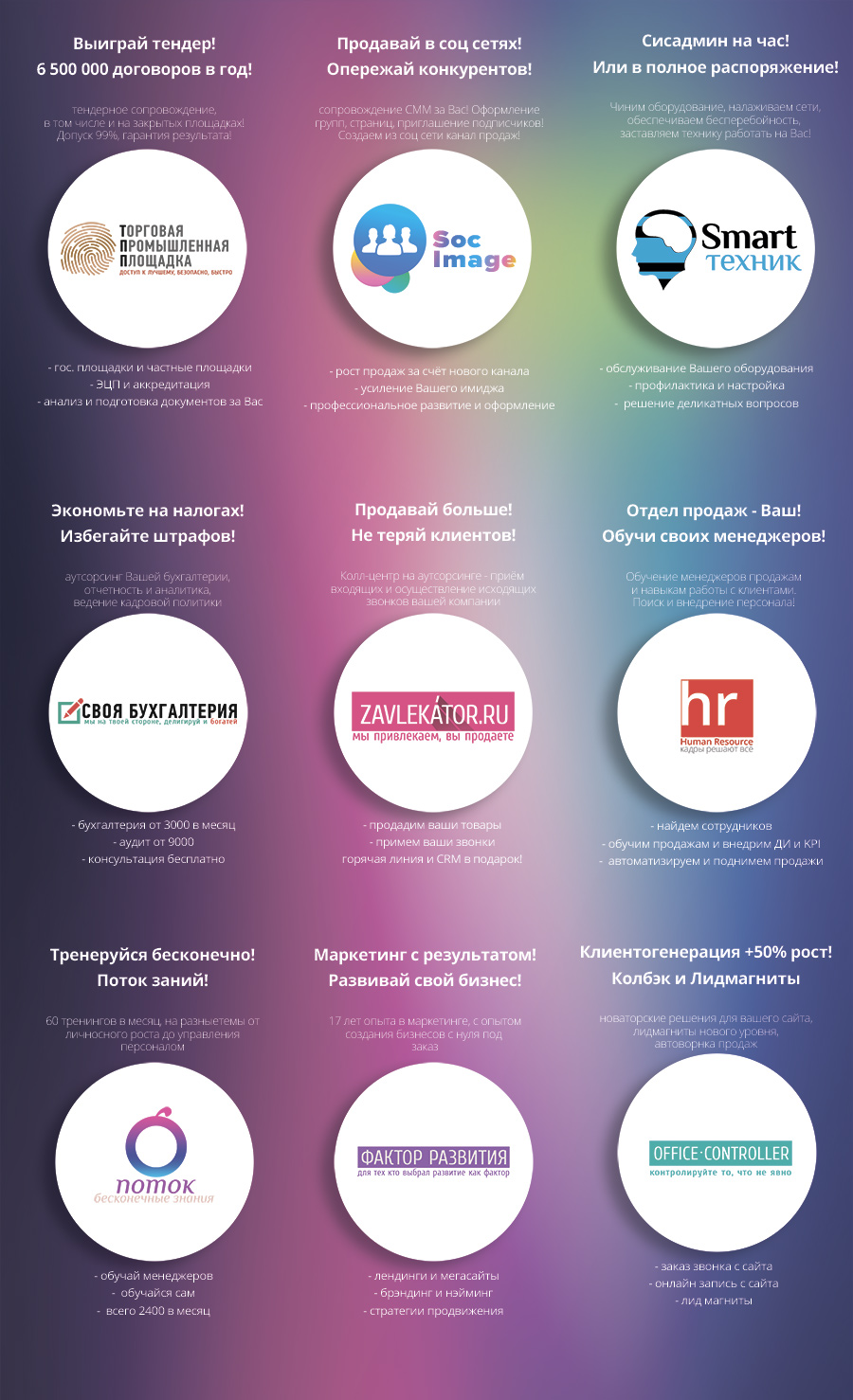 Для этого Мы в одном большом и уютном офисе, размером более 300 квадратных метров, объеденили сразу несколько важных для любого бизнеса сервисов. Отдел СММ (продвижение в социальных сетях), отдел тендерного сопровождения помогающий получать Вам крупные заказы, отдел бухгалтерии на аутсорсинге, отдел полноценного колл-центра, отдел технического сопровождения вашего IT парка, отдел IT разработок и автоматизации, а также маркетинговый отдел полного цикла. |